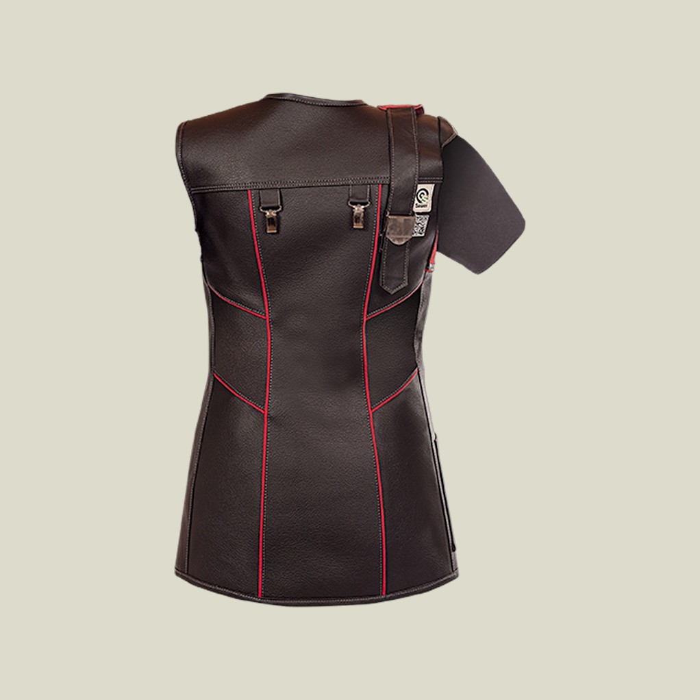 (1) Асимметричный крой плеч для лучшей эргономики при прицеливании. (2) Накладка из замши на плечо для оптимального удержания винтовки при прицеливании. (3) Отверстия для пуговиц с прокладкой для более удобного застегивания. (4) Вставки на внутренних локтях из воздухопроницаемой эластичной ткани облегчают сгибание руки. (5) пять завинчивающихся пуговиц. (6) Рукав обеспечивает оптимальное положение руки для каждой стрелковой стойки (7) Внутренняя подкладка из натурального холста.